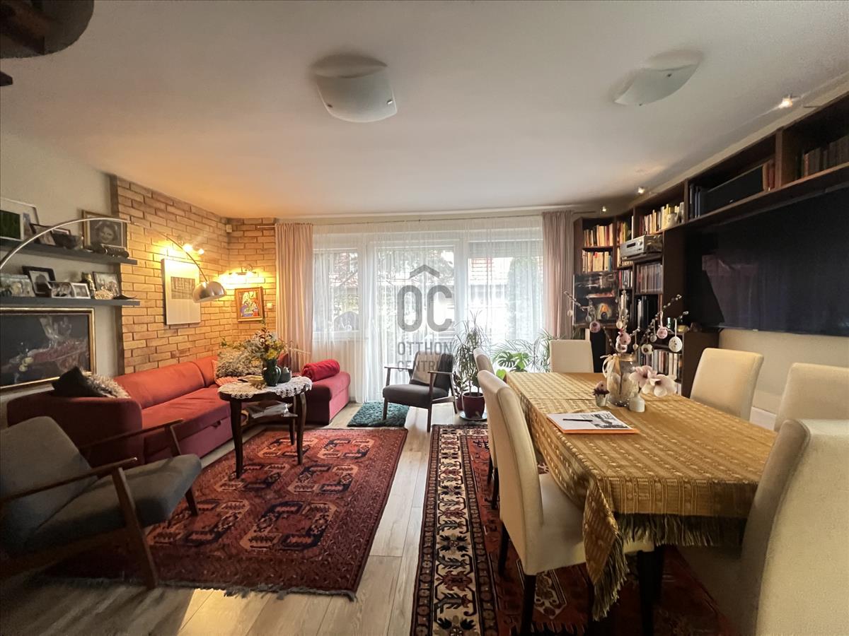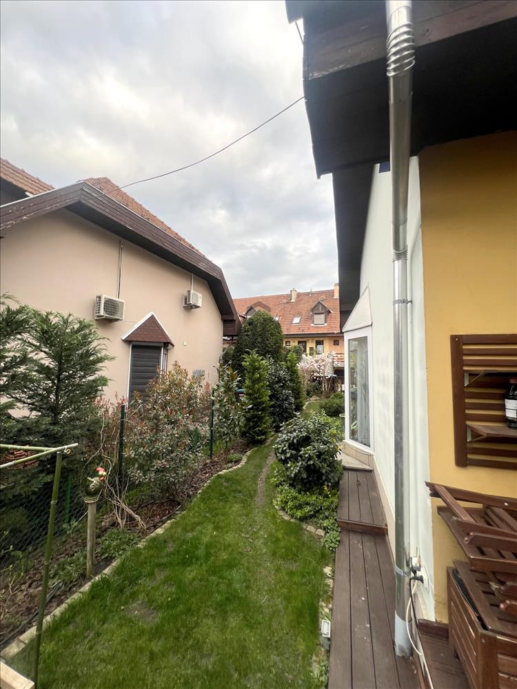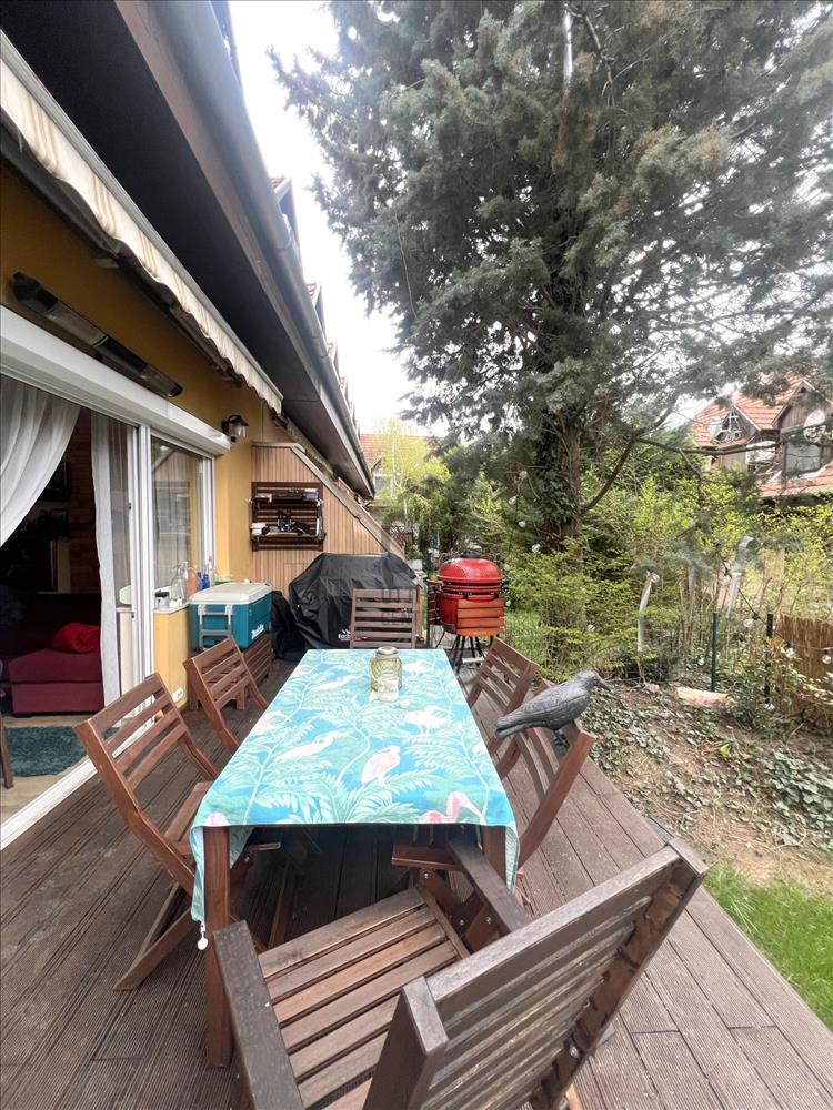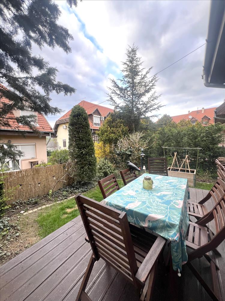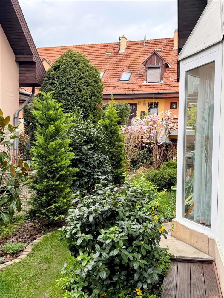 A gondozott, körbejárható kert igazán hangulatos, a nappaliból egy nagy tolóajtón keresztül jutunk ki a teraszra – tökéletes hely a pihenéshez.