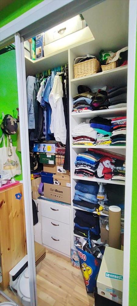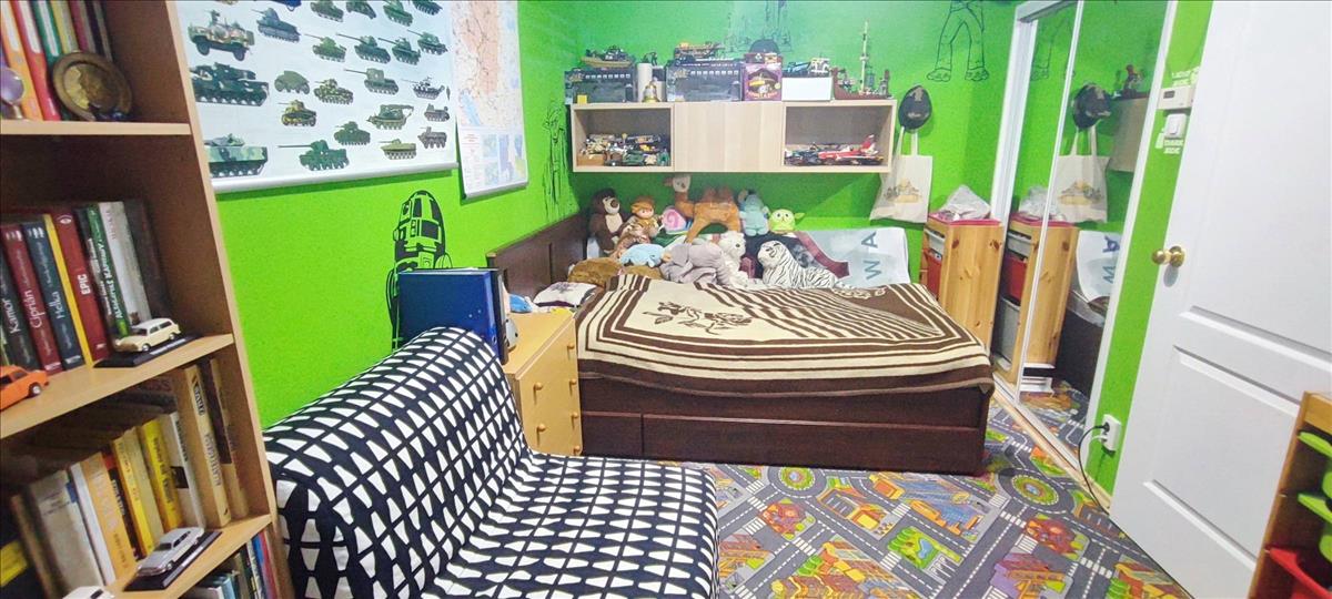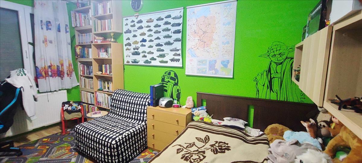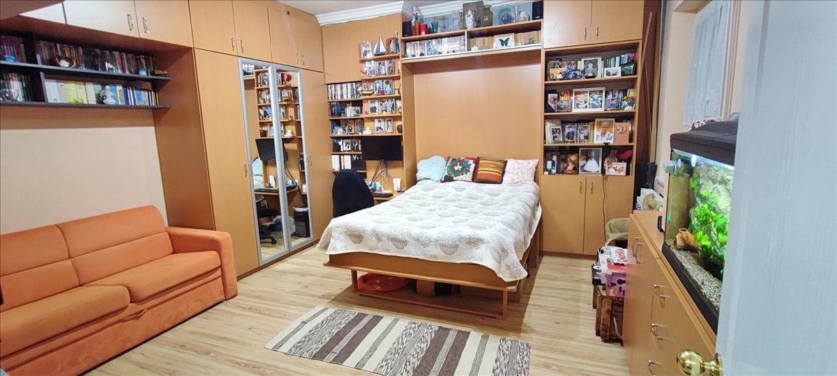 A nagyobbik szoba igen praktikusan beépített szekrényekkel rendelkezik.