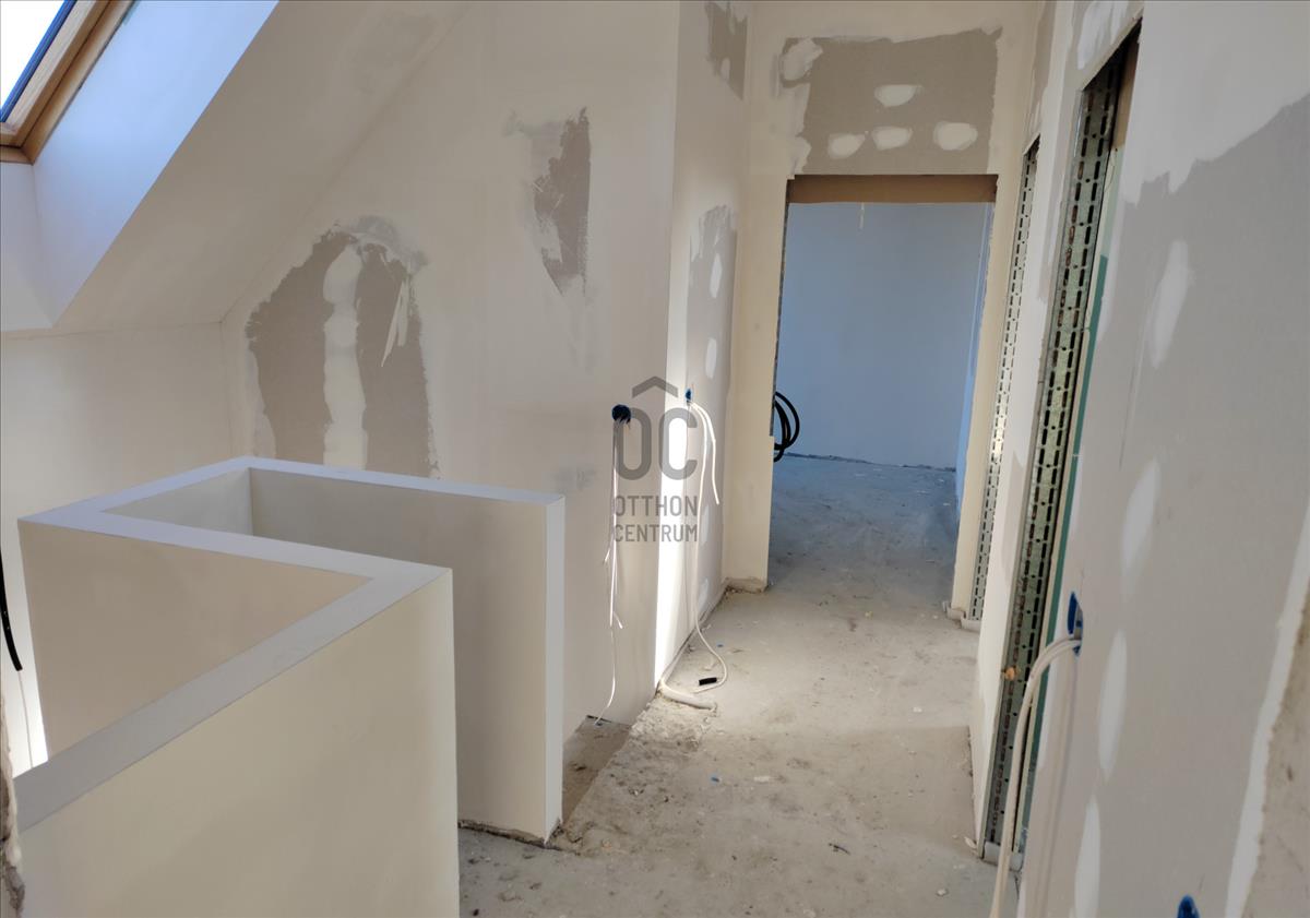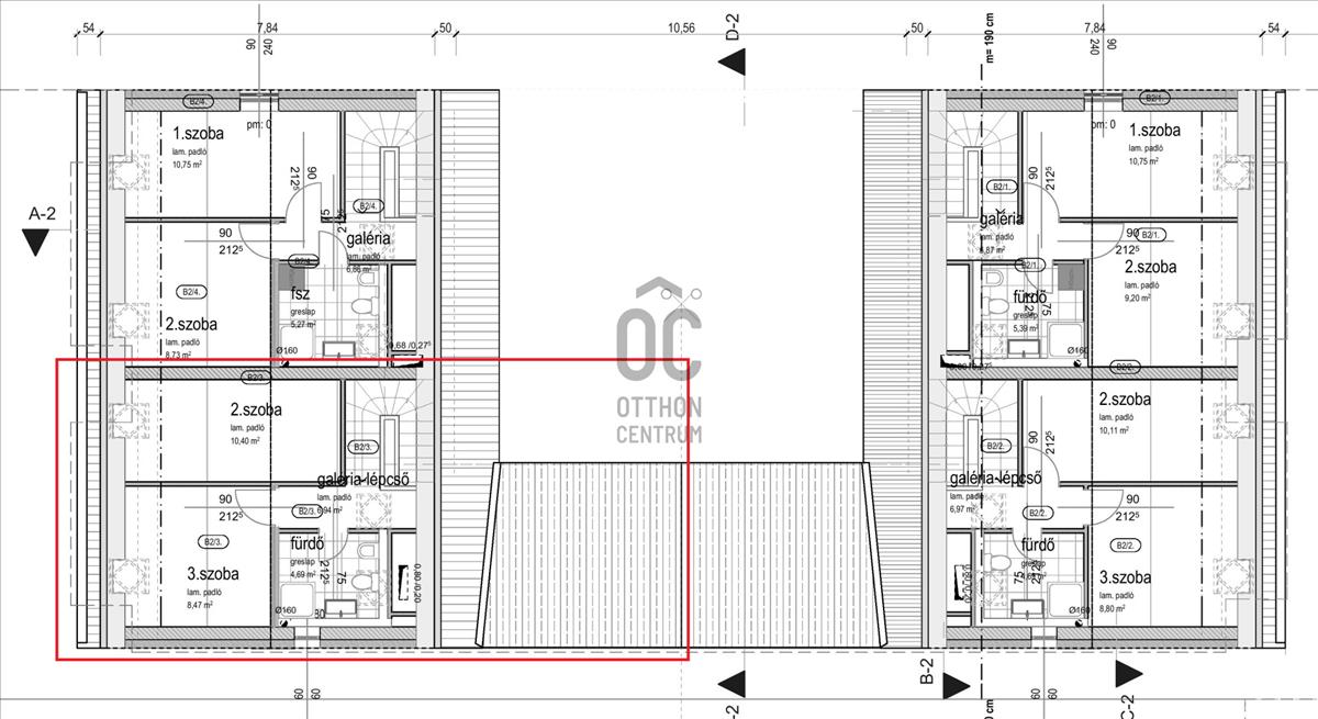 Az emeletre húzottkarú, gipszbeton szerkezetű lépcső vezet fel. Mindkét tetőtéri szobára 2-2 db tetőablakot terveztünk. a lakások