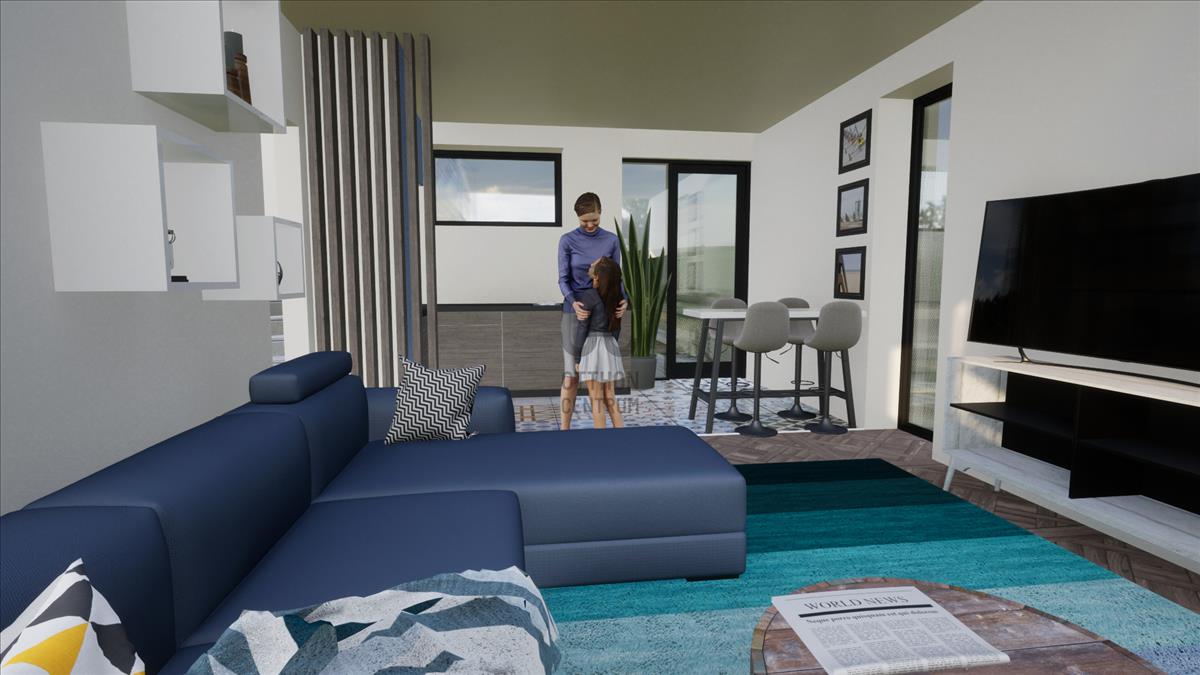 A földszinten elhelyezett étkezőkonyha és nappali összesített alapterülete meghaladja a 26 m2-t. a nappali mérete