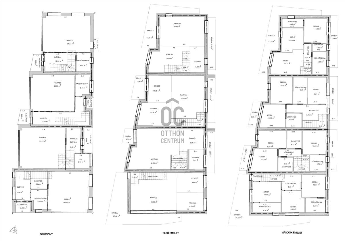 II. emeleti részen: szülői hálószoba gardróbbal és saját fürdőszobával, valamint 2 hálószoba külön fürdőszobával és erkély vagy teraszkapcsolattal