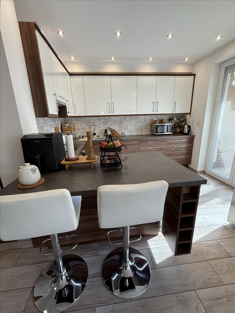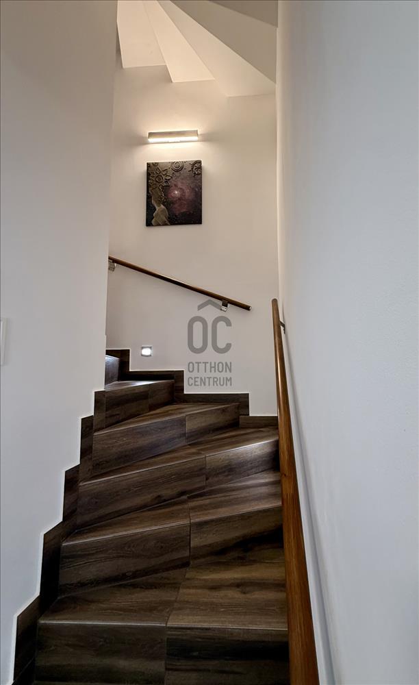 A földszinten egy gyönyörű, elegáns, tágas konyha, fényárban úszó amerikai konyhás nappali- étkező együttese fogad minket, nagyon helyes kis terasszal, kerttel, grillezővel, igazi vendégmarasztaló hangulattal, valamint az előszobából külön nyíló fürdőszoba WC-vel. Szintén az előszobából nyílik egy ajtó a garázsba, így az autóból kiszállva közvetlenül be tudunk jönni a lakásba, míg egy másik autóval a garázs elé, az előkertbe is beállhatunk.