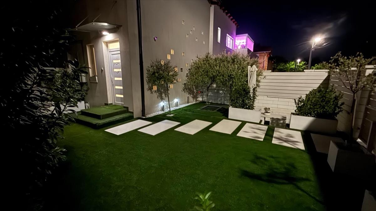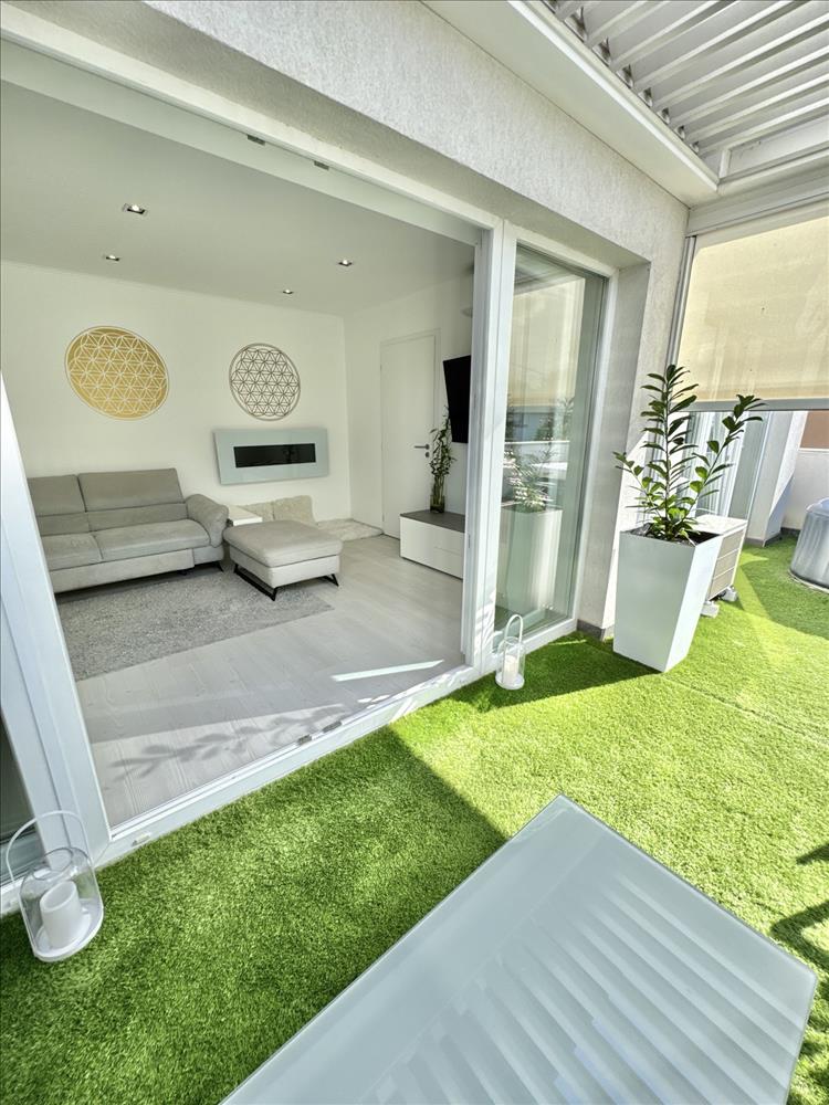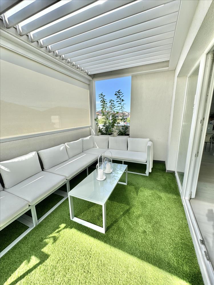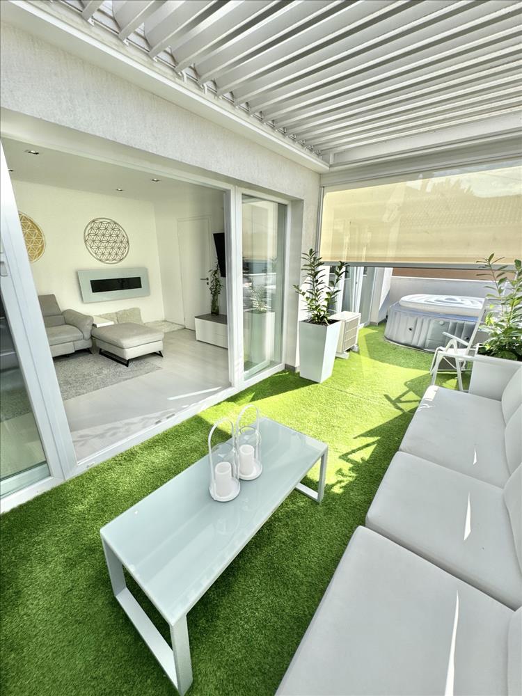A hatalmas méretű teraszon a virágok és kerti bútor szett mellett kényelmesen elfér a jakuzzi is. a teraszon elektromos sötétítő rendszer lett kiépítve hangulatvilágítással (ennek ára 10 millió Ft újonnan).