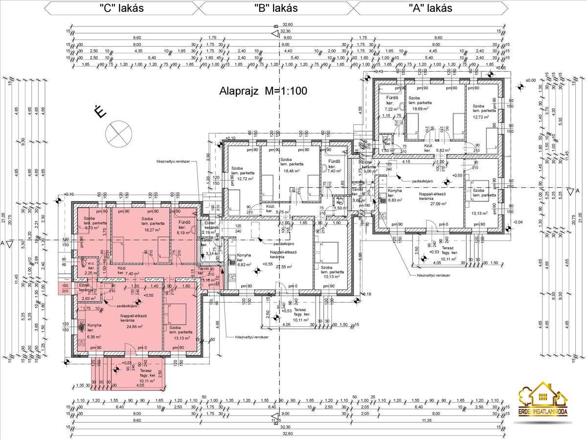 Eladó Dunaharaszti Felsővárosban egy új építésű, nettó 96 m² alapterületű földszintes szélső sorházi lakás. (Az alaprajzon az „c” jelű lakás)A lakásban egy előszoba, egy amerikai konyhás nappali, 3 hálószoba, egy fürdőszoba, egy külön wc és egy kamra került kialakításra. a nappalihoz egy 10 m²-es terasz kapcsolódik. a saját elkerített telek nagysága 407 m².