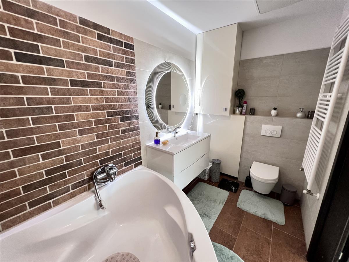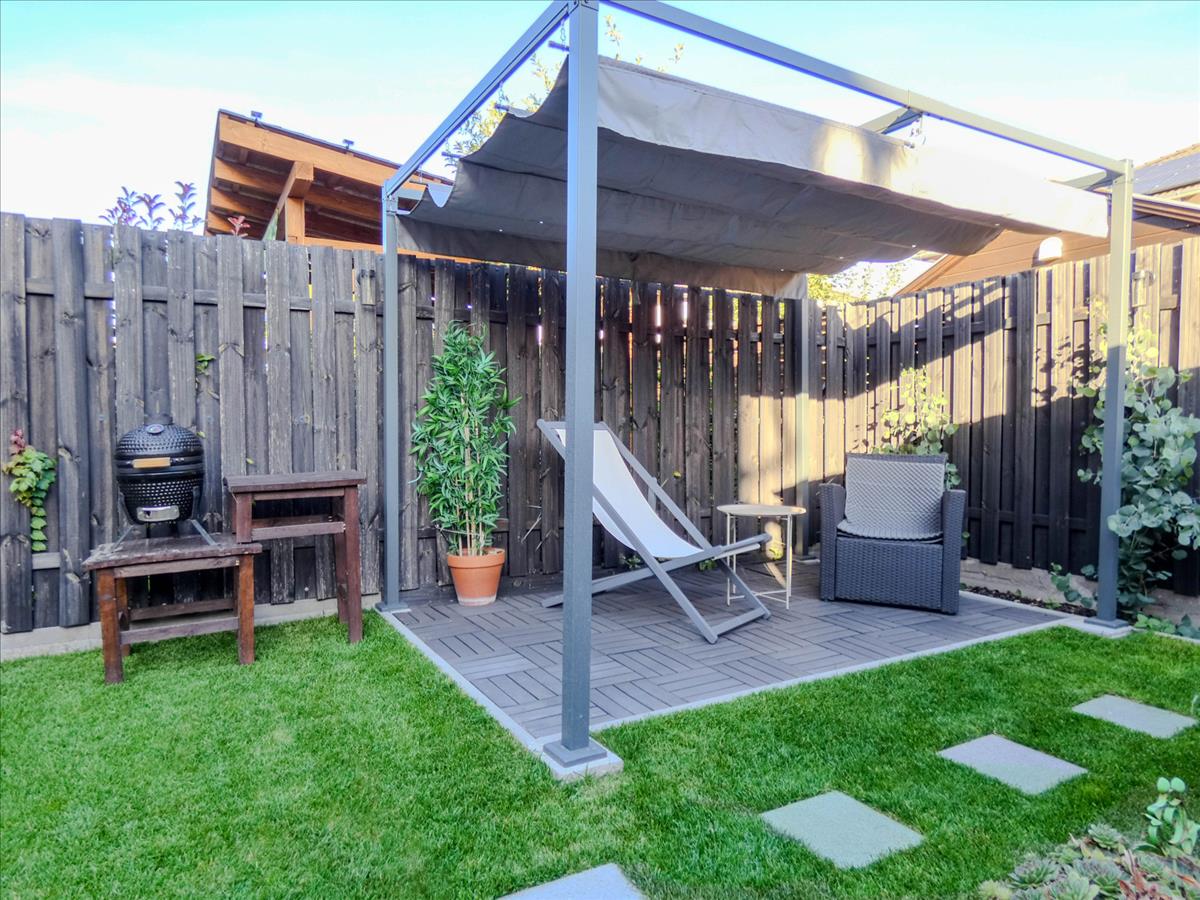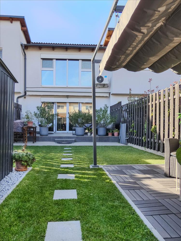 Az exluzív lakáshoz tartozik 195nm saját tulajdonú kert, körbe kerítve. a kertben gyönyörű gyepszőnyeg telepített, tárolásra kisház. a nagy méretű teraszon árnyékoló található.