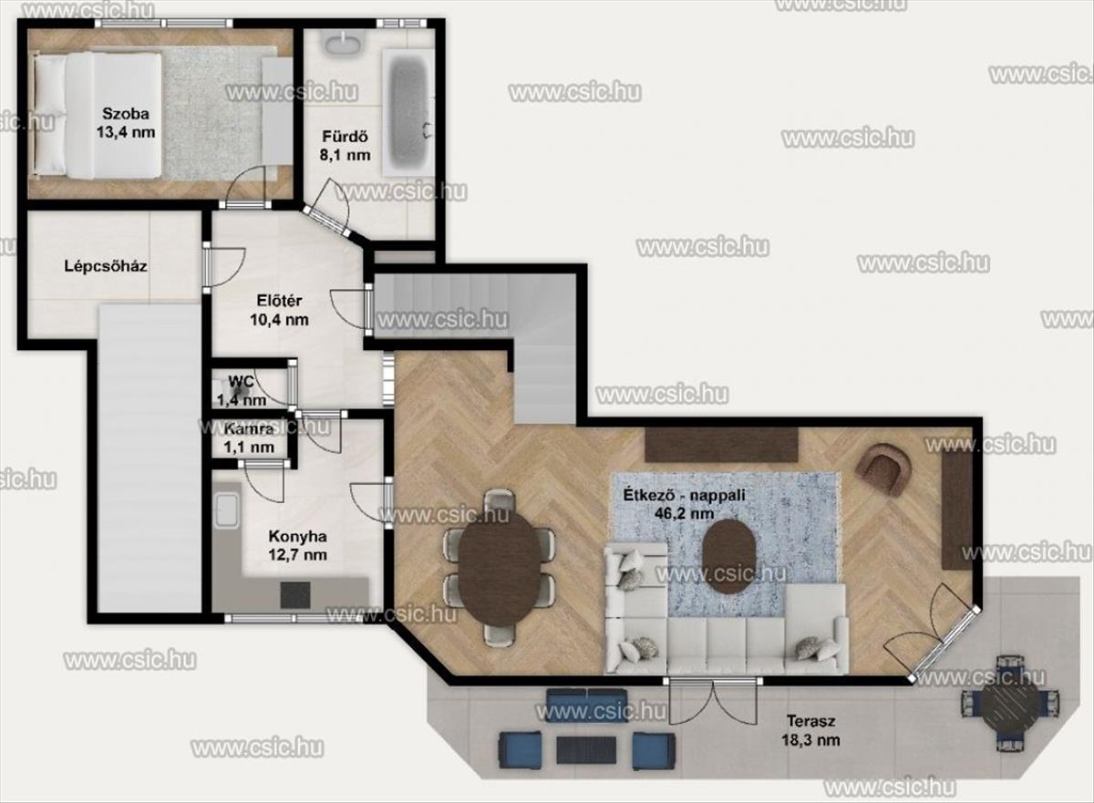LAKÓSZINT – tágas, otthonos, hangulatos. a földszinten egy lenyűgözően világos, 46 m²-es nappali–étkező fogad, közvetlen kapcsolattal egy 18 m²-es teraszhoz.