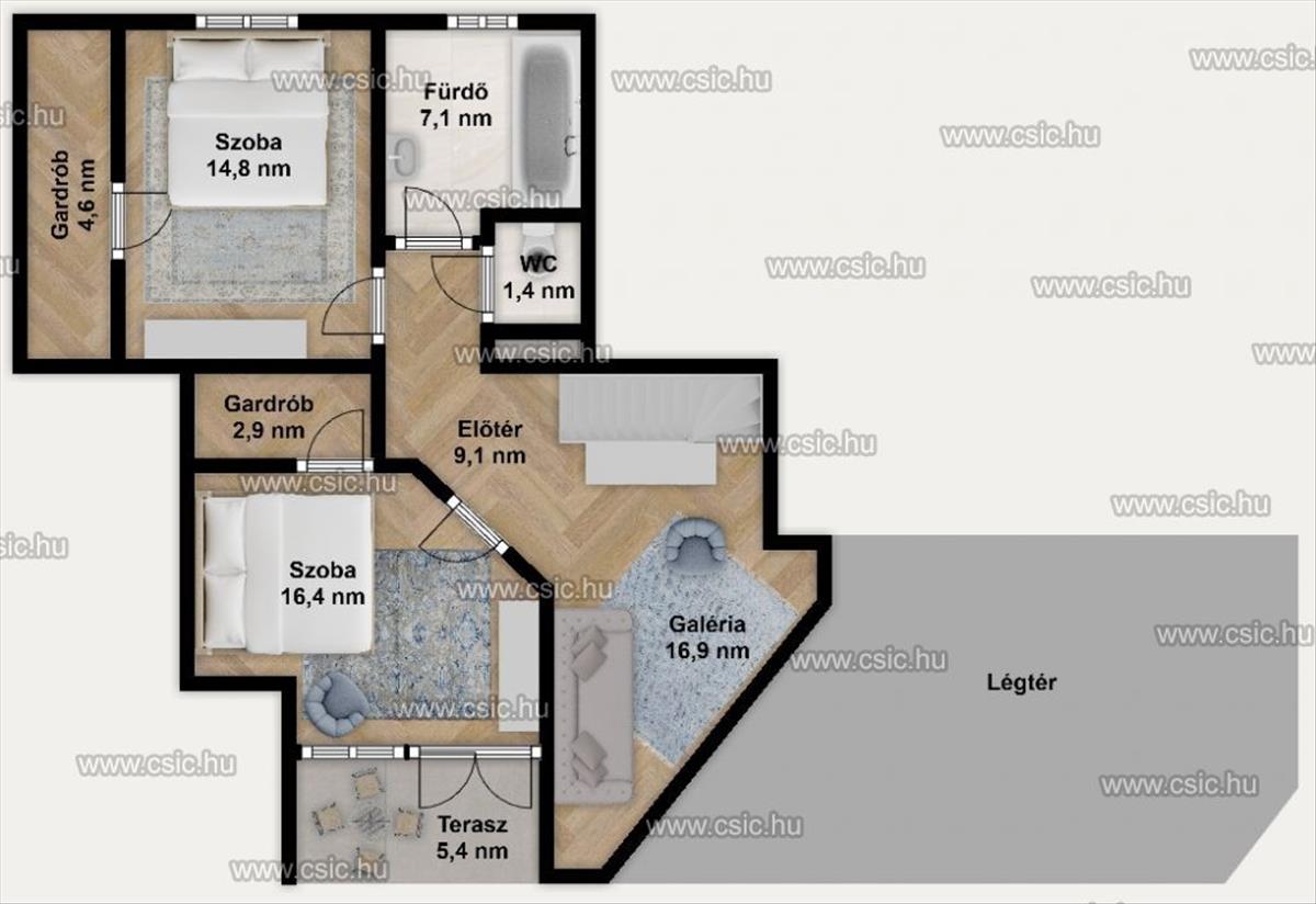 Az emelet belső galériás kialakítású, gyönyörű faburkolatokkal és karakteres, autentikus falépcsővel. Itt két hálószoba kapott helyet, mindkettő saját gardróbbal, valamint előtér, fürdőszoba, külön wc és egy terasz is tartozik hozzájuk.