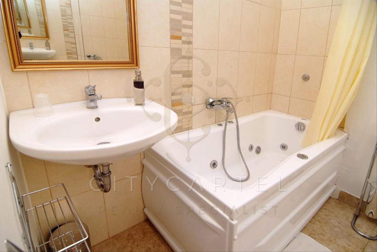 On the garden level, a large lounge with a balcony opens to three rooms, each with a private bathroom and wc, all with balconies. The lounge and two room balconies face the city. The third room, kitchen, and wellness area—including a jacuzzi, sauna, and hydromassage tub with associated equipment—open from another lounge.