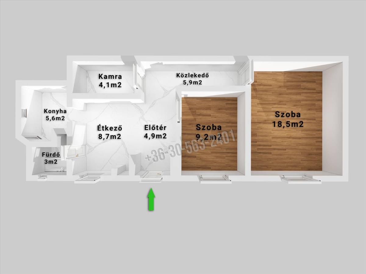 •2 külön nyíló szoba: 9, 2 m² és 18, 5 m²