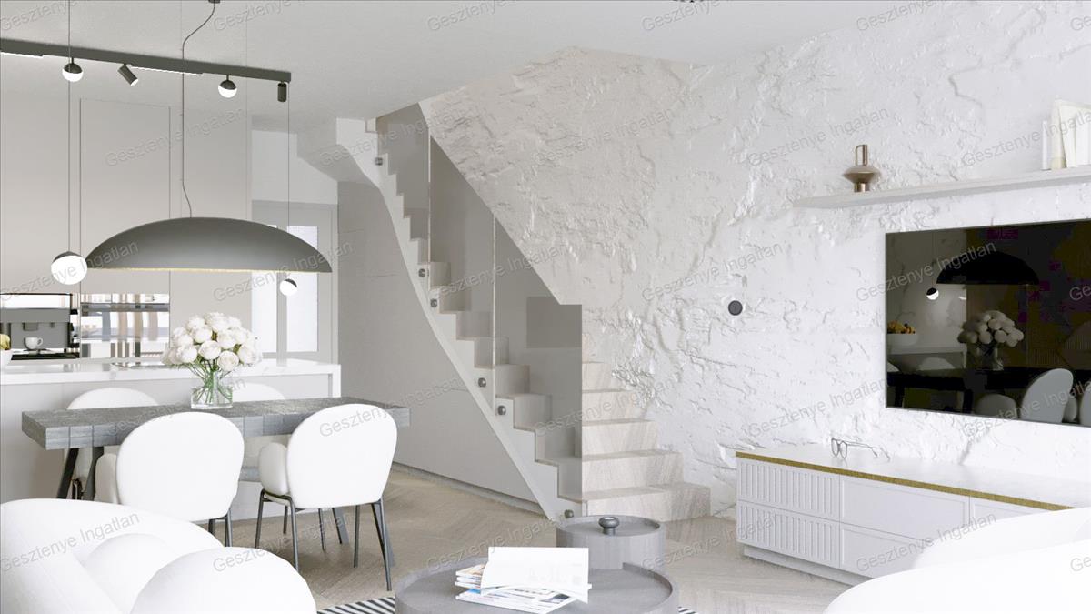 Földszint: előszoba, 1 szoba, fürdő, 31 m²-es amerikai konyhás nappali, terasz- és kertkapcsolattal