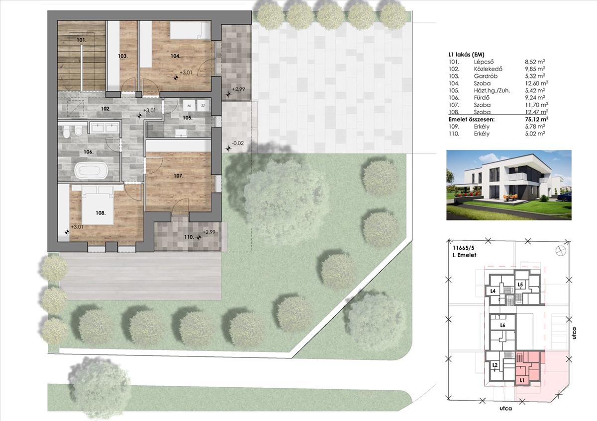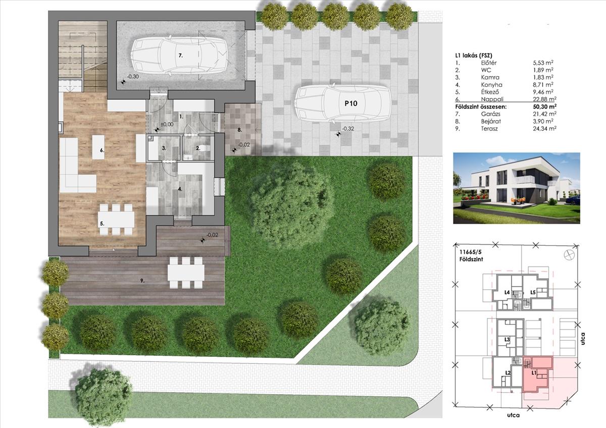 Nettó alapterülete 125, 42 nm, amelyhez 21, 42 nm-es garázs és egy 24 nm-es, burkolt terasz is tartozik.