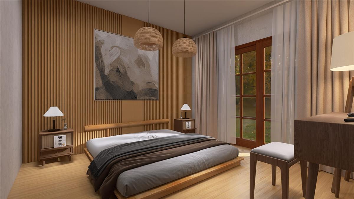 A felső részen három különálló szoba talállható. Két szobából kijárat az erkélyre. Modern kialakítású, tágas fürdőtér, káddal és zuhannyal. Gardróbszoba a kényelmes tárolásra. Háztartási helyiség.