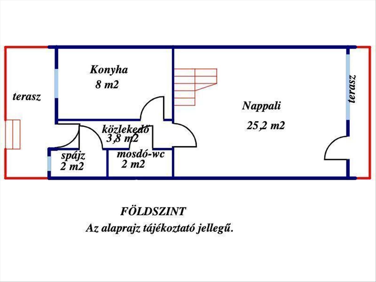 A lakás helyiségei: földszinten egy nappali, konyha, kamra, közlekedő és WC-mosdó helyiség, és terasz,