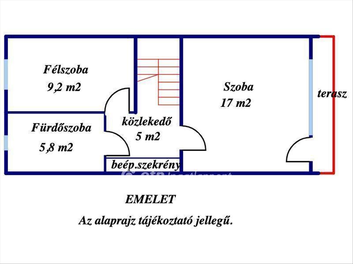 emeleten: egy szoba, loggia, egy félszoba, közlekedő, fürdőszoba található,