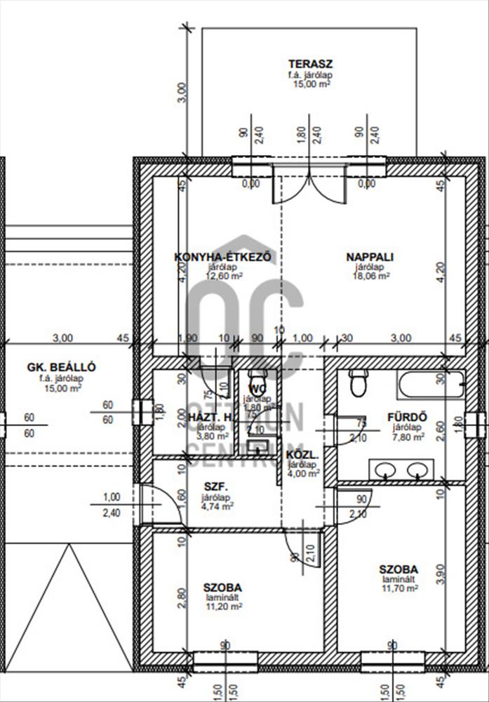 Az épület nettó 75 nm alapterületű, nappali+ 2 hálószoba.
