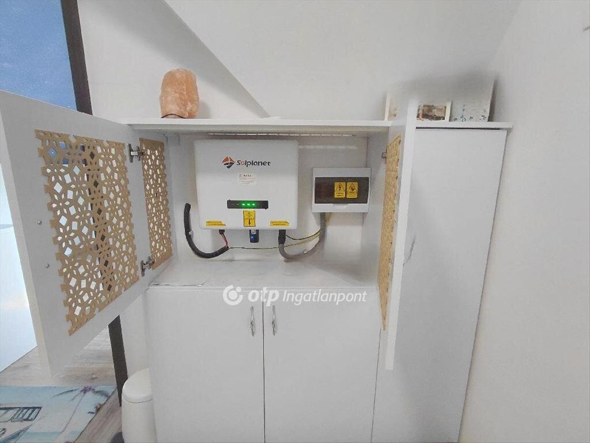 A földszinten egy félszoba, egy tágas amerikai konyhás nappali, kamra, előtér és fürdőszoba wc-vel, az emeleten két szoba, fürdszoba wc-vel, gardrób és előtér került kialakításra. Az otthon melegéről elektromos kazán és hűtő-fűtő klíma gondoskodik, az alacsony fenntartást napelemek biztosítják! Az ingatlanhoz tartozik egy 15 nm -es elkerített udvar, valamint két autó számára elegendő parkolóhely a ház előtt.
