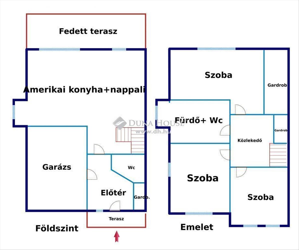 - kiváló elosztású nappali + 3 szoba + fürdő, 2 wc, tágas nagy fedett terasz, saját kis kert, kerti tároló