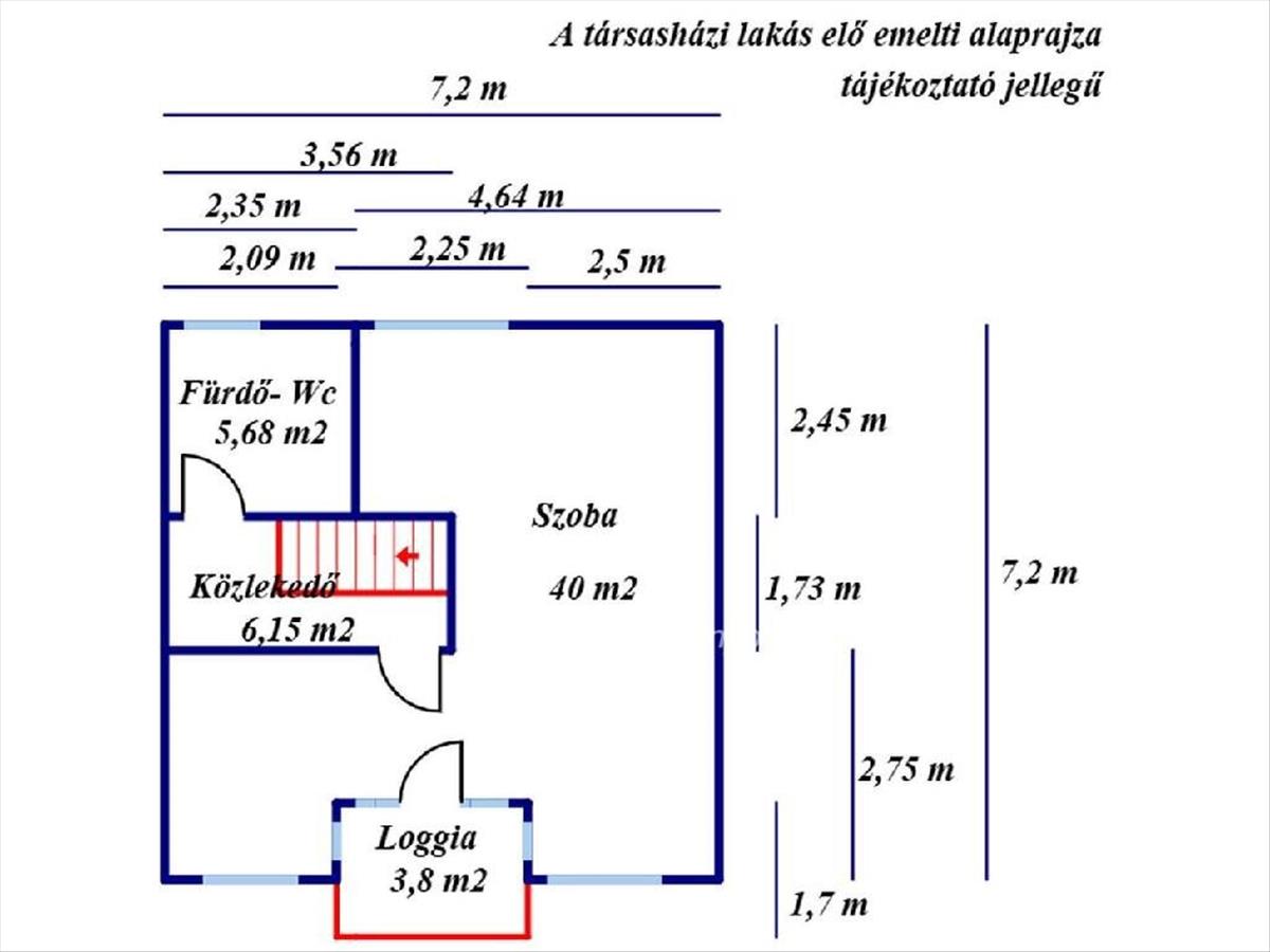 Az első emeleten egy szoba, egy fürdőszoba- wc helyiség, egy közlekedő és egy loggia található. a szoba parketta-, a többi helyiség járólap burkolatot kapott.