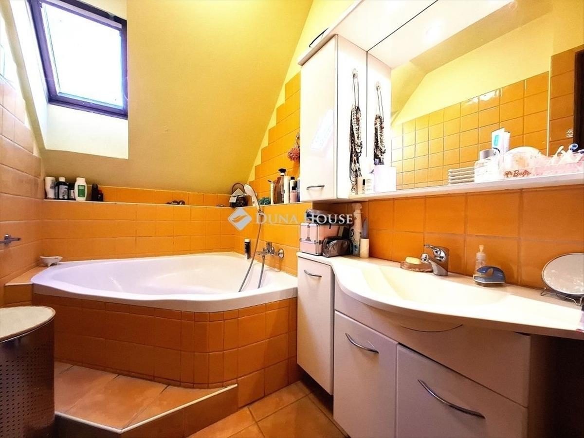 A napsárga csempével burkolt világos, tágas, sarokkádas kialakítású fürdőszobába a tetőablakon át bőséges napfény jut, a lépcsős megközelítésű sarokkád és a kád körüli pakolófelületek budoárérzést nyújtanak, napfürdőre adnak lehetőséget. Az emeleten külön apró helyiségben kapott helyet a WC.