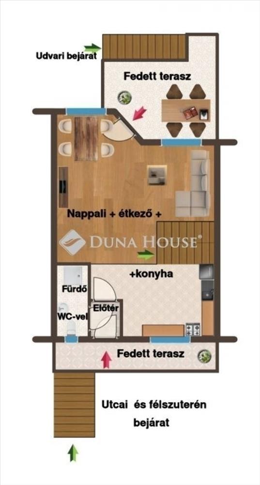 -földszinti udvari félig fedett terasz: 10, 26 m2, mely nem tartalmazza az udvarra vezető lépcsőt