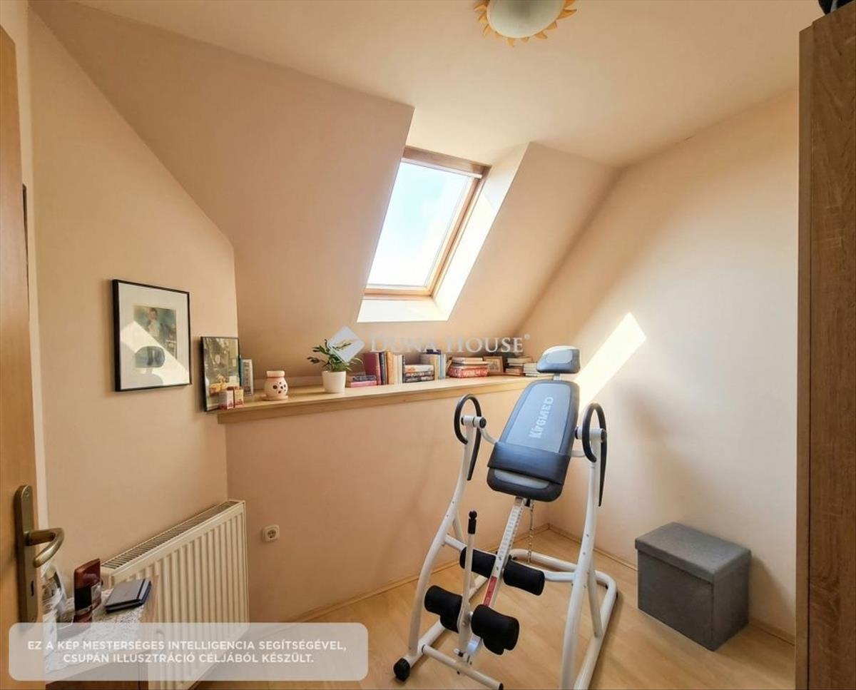 A tetőtérbeépítéses emeleti életteret egy lépcsőn keresztül, a kerámiaburkolatos közlekedőre jutva közelíthetünk meg, ahol barátságos hangulat fogad minket. Innen nyílik 3 félszoba, a fürdőszoba és egy külön apró helyiség WC-vel. a 7-8 m2-es, tiszta területtel rendelkező napsütötte, világos szobák jó elrendezésüknek és a kényelmes belmagasságnak köszönhetően méretük ellenére tágasnak tűnnek, kényelmesen elfér mindegyikben az intim életérzést keltő berendezés és elegendő teret nyújtanak a pihenésre, tanulásra, elmélyülésre. Minden helyiségben a barna, tömörfa nyílászárók a jellemzőek. Az összes szoba klímaberendezéssel felszerelt.