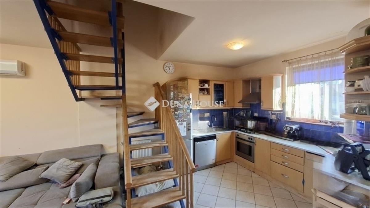 Az épület egy csendes, aszfaltos utcáról, gondozott, zöld felületekkel övezett közterületen keresztül közelíthető meg. Az értékesítésre váró telekrészre az ügyvédi megosztó szerint kimért, kerítéssel elválasztott előkertre nyíló kis- és nagykapunk jutunk be, hogy onnan autóval a ház alatti garázsba vagy néhány lépcsőfok megtételét követően a fedett teraszon át a lakásba juthassunk. a dél-nyugati fekvésű teraszról nyíló bejárati ajtón az előtéren keresztül a lakás lelkét adó tágas nappaliba érkezünk. a család apraja-nagyja a földszinti életteret benépesítheti, mivel a nappali egy légtérben van az étkezővel és a lehelletnyit elválasztott, jól felszerelt konyhával. Az amúgy is világos, az utcai és udvari oldal felőli ablakok általi körbe-napozás miatt egész napon át napfényes 34 m2-es nappali-étkező-konyha élettérből a jó idő kicsábítja az embert a szabadba. Erre lehetőséget nyújt az ugyancsak tágas fedett teraszon elköltött családi ebéd, sütögetés vagy finom kávézás. a konyhai élettér az utcafronti ablakhoz közeli és hidegburkolattal ellátott. a nappali és étkező padlója diszkréten elválasztja egymástól a tágas életteret. a radiátoros fűtésen túl egy hűtő-fűtő klíma szolgálja a kellemes hőérzetet. a földszinten található egy, az előtérből nyíló zuhanyzós fürdőszoba WC-vel. a nappaliból egy faburkolatos lépcsőn keresztül távozhatunk az emeleti szobákba. a tetőtérbeépítéses emeleti életteret egy lépcsőn keresztül, a kerámiaburkolatos közlekedőre jutva közelíthetünk meg, ahol barátságos hangulat fogad minket. Innen nyílik 3 félszoba, a fürdőszoba és egy külön apró helyiség WC-vel. a 7-8 m2-es, tiszta területtel rendelkező napsütötte, világos szobák jó elrendezésüknek és a kényelmes belmagasságnak köszönhetően méretük ellenére tágasnak tűnnek, kényelmesen elfér mindegyikben az intim életérzést keltő berendezés és elegendő teret nyújtanak a pihenésre, tanulásra, elmélyülésre. Minden helyiségben a barna, tömörfa nyílászárók a jellemzőek. Az összes szoba klímaberendezéssel felszerelt. a napsárga csempével burkolt világos, tágas, sarokkádas kialakítású fürdőszobába a tetőablakon át bőséges napfény jut, a lépcsős megközelítésű sarokkád és a kád körüli pakolófelületek budoárérzést nyújtanak, napfürdőre adnak lehetőséget. Az emeleten külön apró helyiségben kapott helyet a WC.