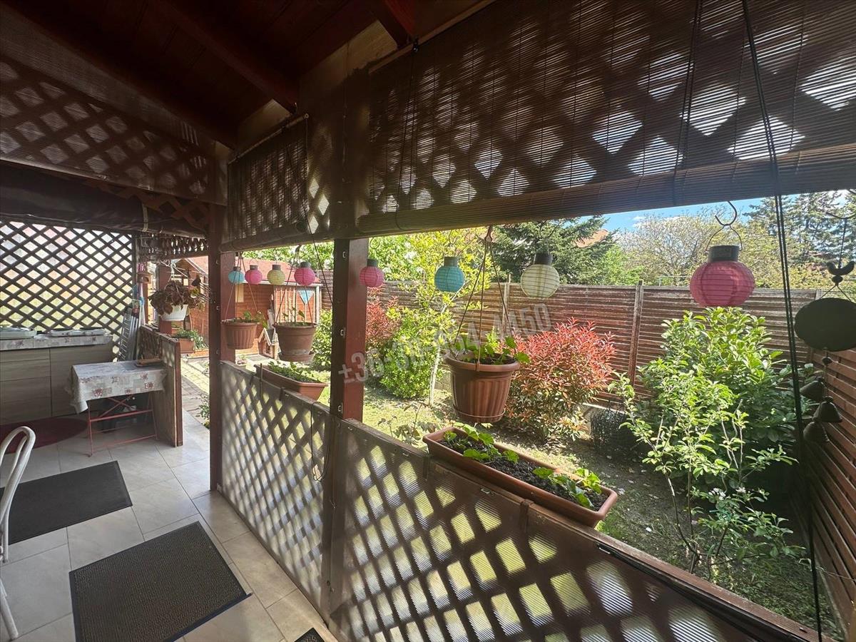 Parkosított, gondozott kert tujákkal, fákkal és virágokkal, ideális pihenésre vagy családi programokra. a kertben egy 4 nm -es tároló is helyet kapott.