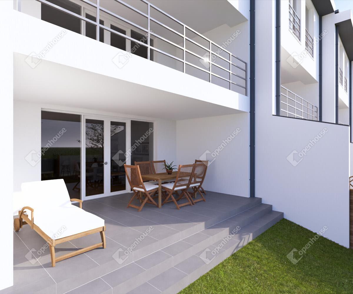 A nappaliból közvetlen terasz- és kertkapcsolat nyílik a lakásonként önállóan és elkerítve használható 80 m2-es zöldterületre.
