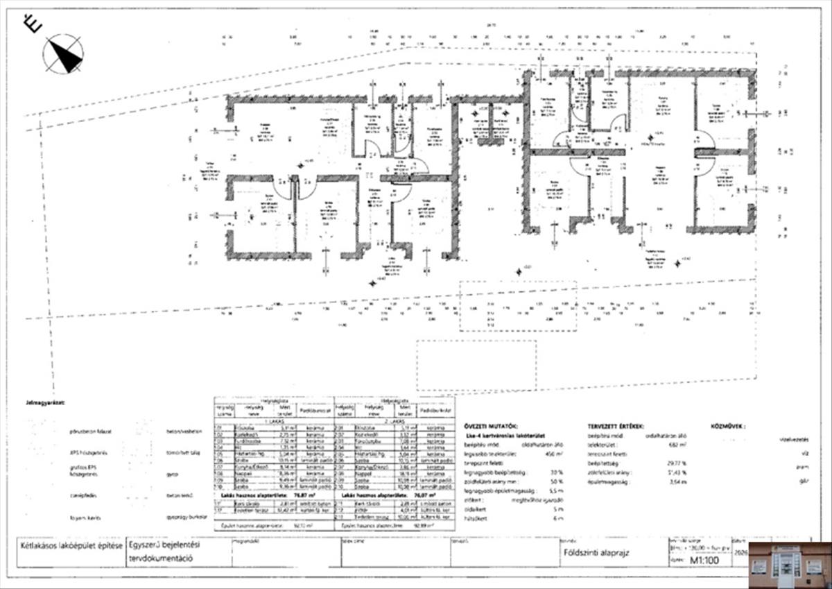 Az 1. Lakás lakóterülete 76, 87 m2, melyben előszoba (5, 11 m2), nappali (18, 36 m2), konyha-étkező (8, 14 m2), közlekedő (2, 75 m2), 1. Szoba (10, 15 m2), 2. Szoba (9, 49 m2), 3. Szoba (9, 36), fürdőszoba (7, 12 m2), wc (1, 35 m2), és háztartási helyiség (5, 04 m2) található, valamint egy fedett terasz (12, 42 m2) van a bejárat előtt. a két lakás nem ér össze, közöttük kerti tároló (2, 81 m2) van.