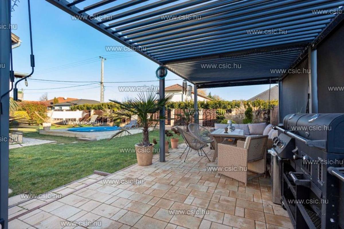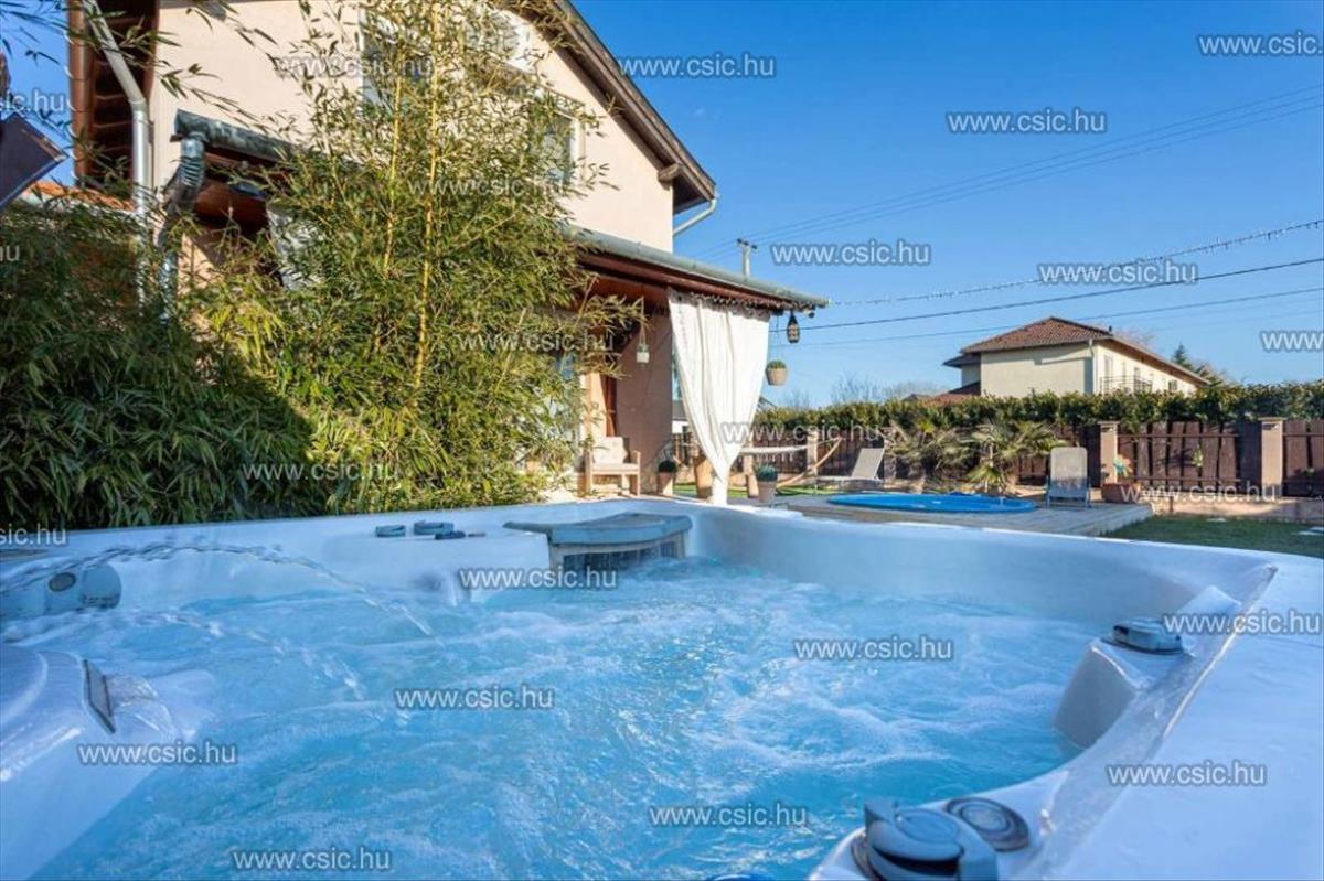 A gondosan kialakított, teljesen rendezett kert és a prémium kültéri elemek – medence, jacuzzi, pergola – egy valódi, azonnal élhető életteret biztosítanak.