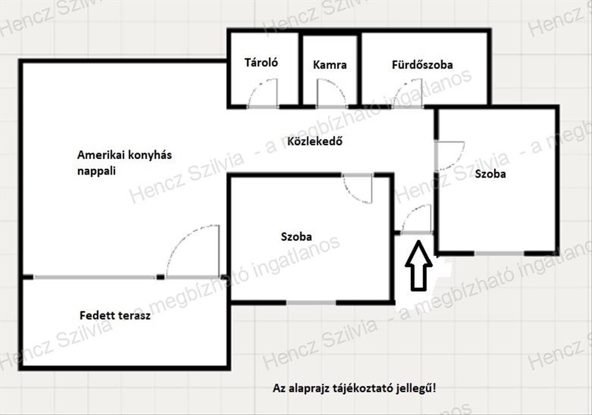 - Elosztás: Amerikai konyhás nappali, 2 hálószoba, közlekedő, fürdőszoba WC-vel, tároló, éléskamra.