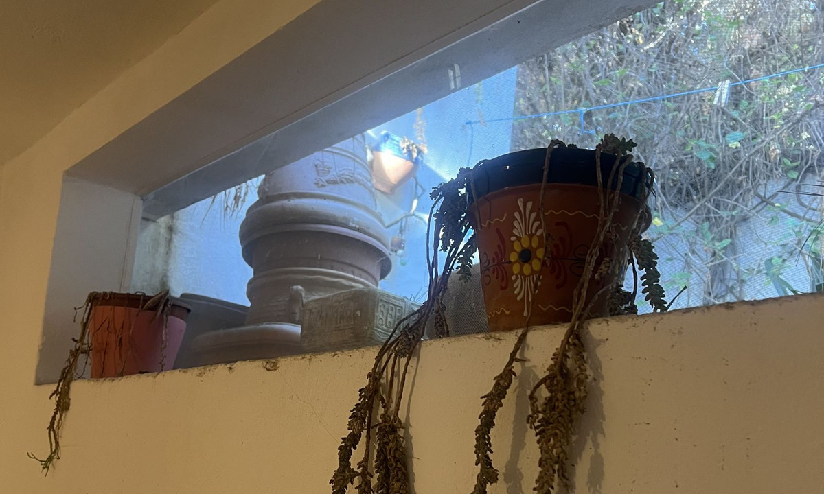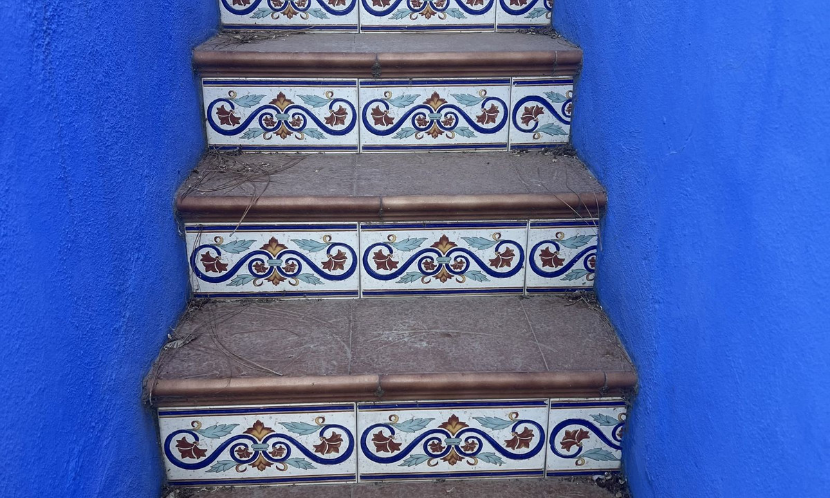 Egy kis kerti terasz Andalúziai csempe, arra várva, hogy átalakítsák egy nyugodt kültéri menedék