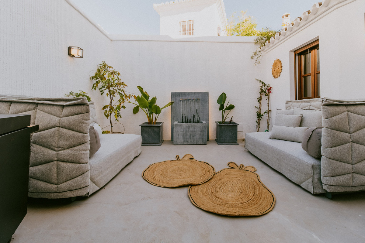 Ez a világos és hívogató 3 hálószobás ház könnyedén ötvözi a sárm a hagyományos andalúziai design frissített modern esztétika. Ideális helyen található minden kényelem és csak pillanatok a híres Puente Romano, Golden Mile, Marbella, ez a gyönyörű otthon kínál a tökéletes keveréke kényelem és a stílus.A nyitott terű lakó- és étkező természetes fényben fürdõzik, luxus, mégis kényelmes helyet biztosít egy igazi fakandallóval, tökéletes pihenésre vagy szórakozásra. a tágas üvegajtók egy magán andalúziai stílusú teraszhoz vezetnek, amely nyugodt pihenést kínál a szabadban.