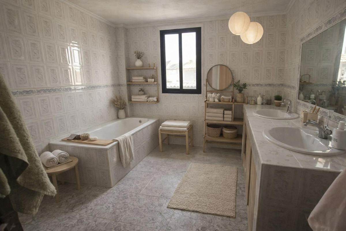 Nagy fürdőszoba káddal és dupla mosogatóval