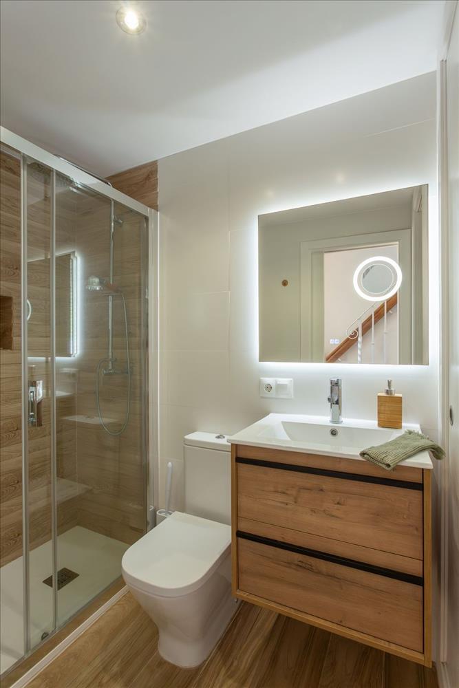A földszinten van a teljesen felújított fürdőszoba zuhanyzóval és a hálószoba, valamint a gyönyörű hátsó terasz.
