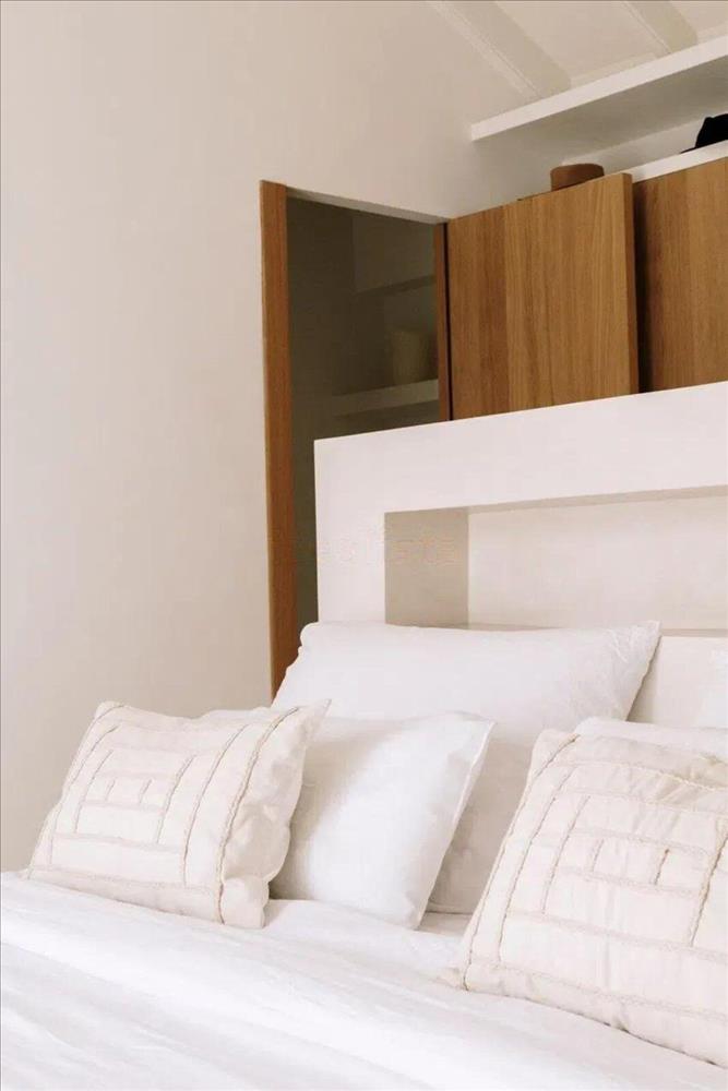 Master hálószoba nyitott kilátással La Concha. Mikrocement ágy alap és 200x200 cm-es franciaágy beépített elektromos csatlakozókkal. Elektromos redőnyök és dupla üveges ablakok. Tölgyes szekrényekben épült.