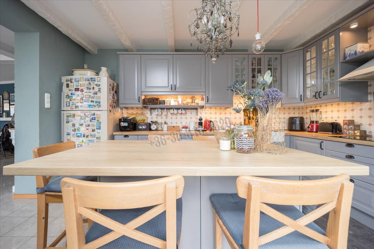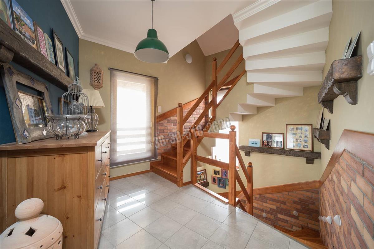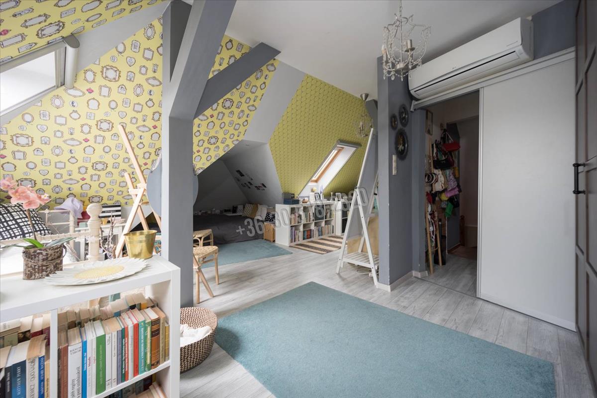 A három szinten elhelyezkedő, közel 214 m²-es lakótér rendkívül átgondolt kialakítású. a földszinten található tágas nappali, étkező és konyha egy légtérben helyezkedik el, amely világos, barátságos központi életteret teremt, tökéletes mind a mindennapi élethez, mind a vendégek fogadásához. Az emeleti és tetőtéri szinteken kialakított hálószobák kényelmes életteret biztosítanak akár nagyobb család számára is, a jelenlegi négy hálószoba mellett további egy szoba is könnyedén kialakítható. a beépített konyhabútor, a praktikus tárolóhelyiségek, valamint a két fürdőszoba és külön mellékhelyiség mind a funkcionalitást erősítik.