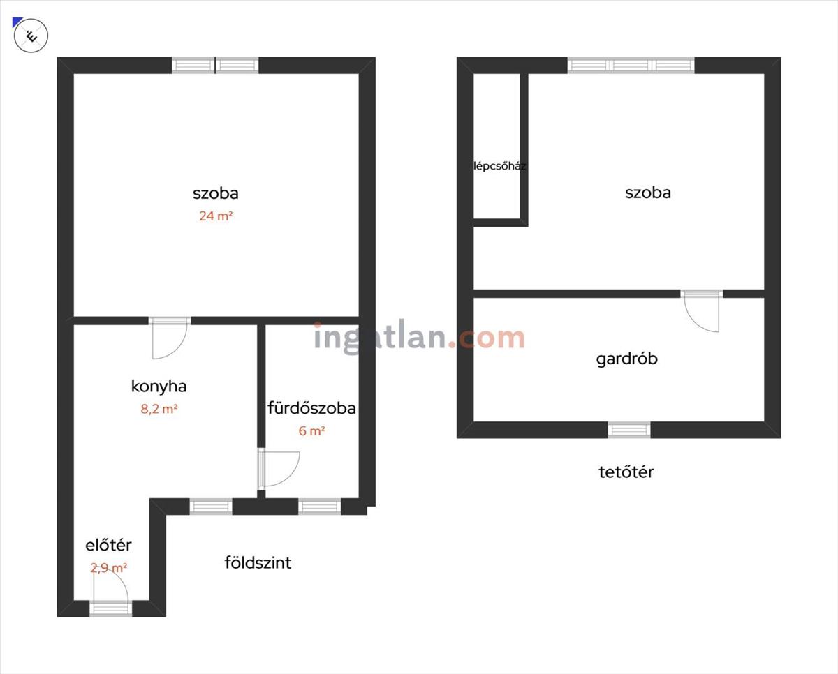 •Földszint: Előtér-konyha, fürdőszoba, valamint egy tágas, világos szoba, ahonnan kilátás nyílik a településre.