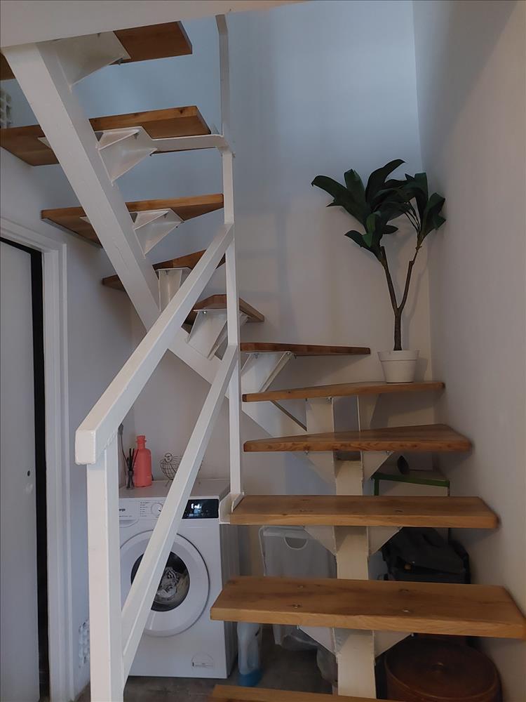 Felső szint: a ház oldalában lévő külső lépcsőn jutunk egy hatalmas teraszra, innen van a bejárat. Alul egy fürdő zuhannyal, egy előtér, egy konyha és egy nagy szoba található. a belső lépcsőn feljutva pedig két szoba és egy fürdőszoba káddal. Ez a szint is teljesen felújított, a burkolatok kivételével. Ez a lakrész 62 nm.