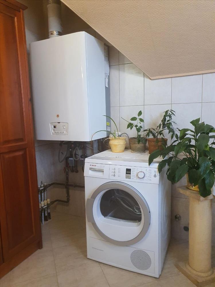 A ház fűtéséről és melegvíz ellátásáról, a felső fürdőszobában elhelyezett turbós gázkazán gondoskodik. a két szint fűtése külön – külön szintenként szabályozható.