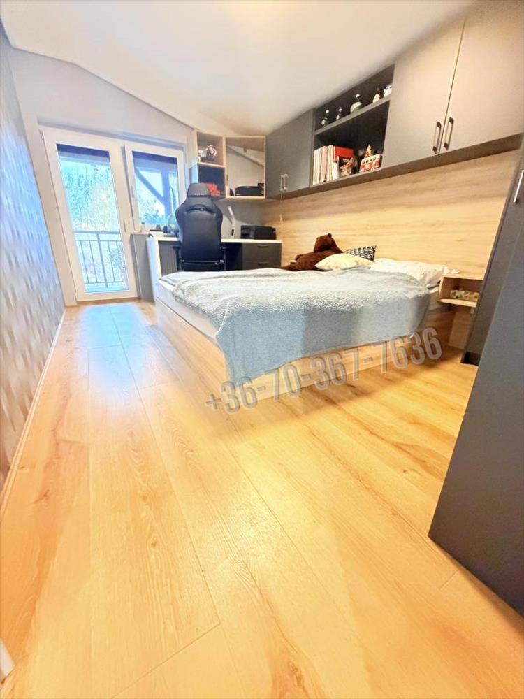 A felső szinten három hálószoba és egy gardrób vár, a két szobából közvetlenül kiléphetsz a fedett erkélyre, ahonnan a természet látványa minden nap új békét ad.