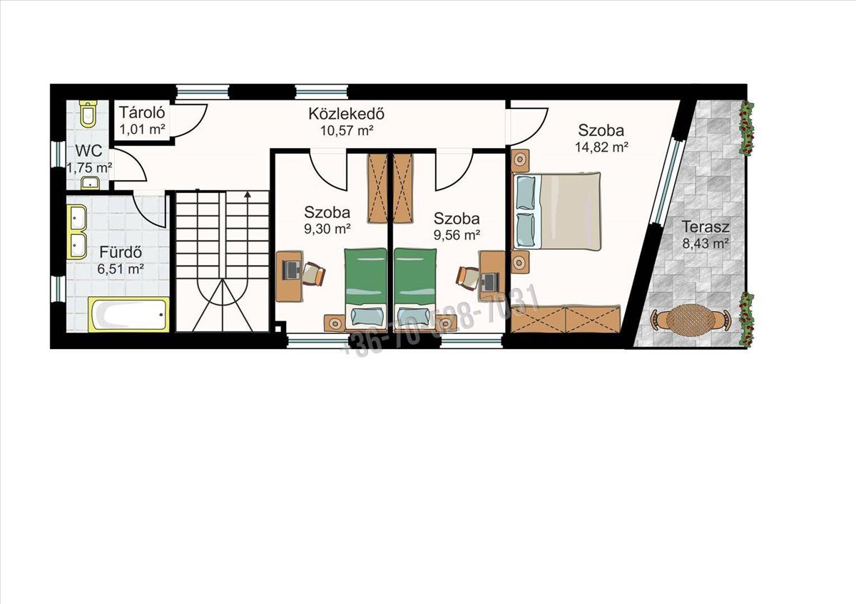 – három különnyíló hálószoba: 9, 3, 9, 56 és 14, 82 m²