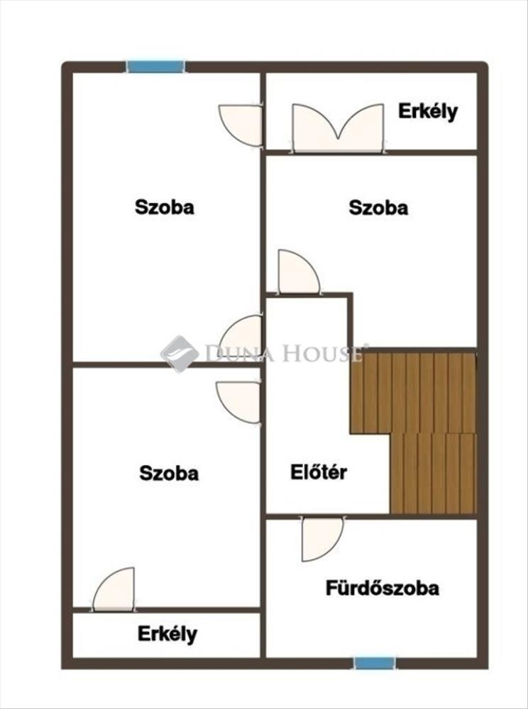 Emelet (teljes belmagasságú): 3 szoba, fürdőszoba WC-vel, 2 erkély