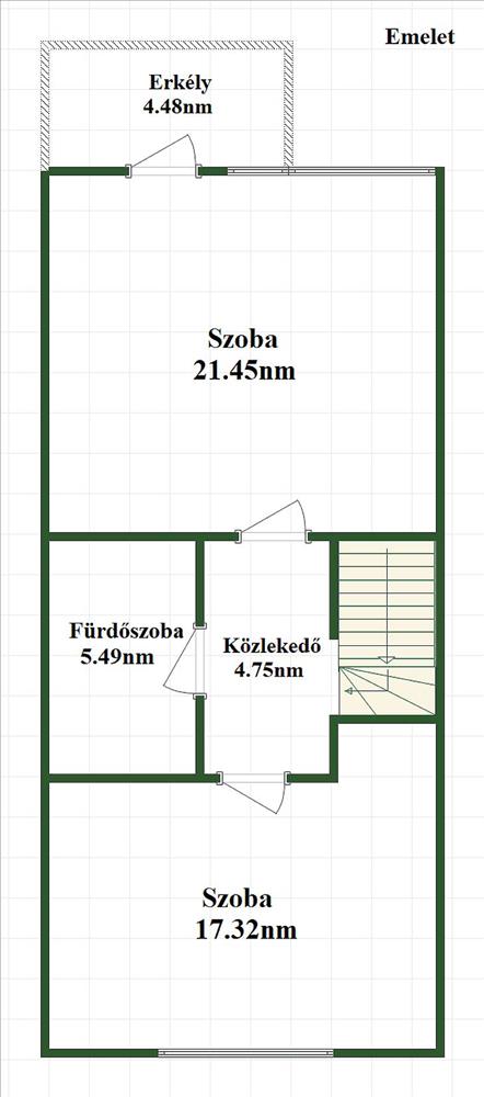 Az emeleten egy kényelmes méretű fürdőszoba WC-vel, valamint két világos, erkélykapcsolatos szoba került kialakításra. a padlástér félig beépített, ablakokkal ellátott, így igény szerint további szobák kialakítására is kiváló lehetőséget kínál.