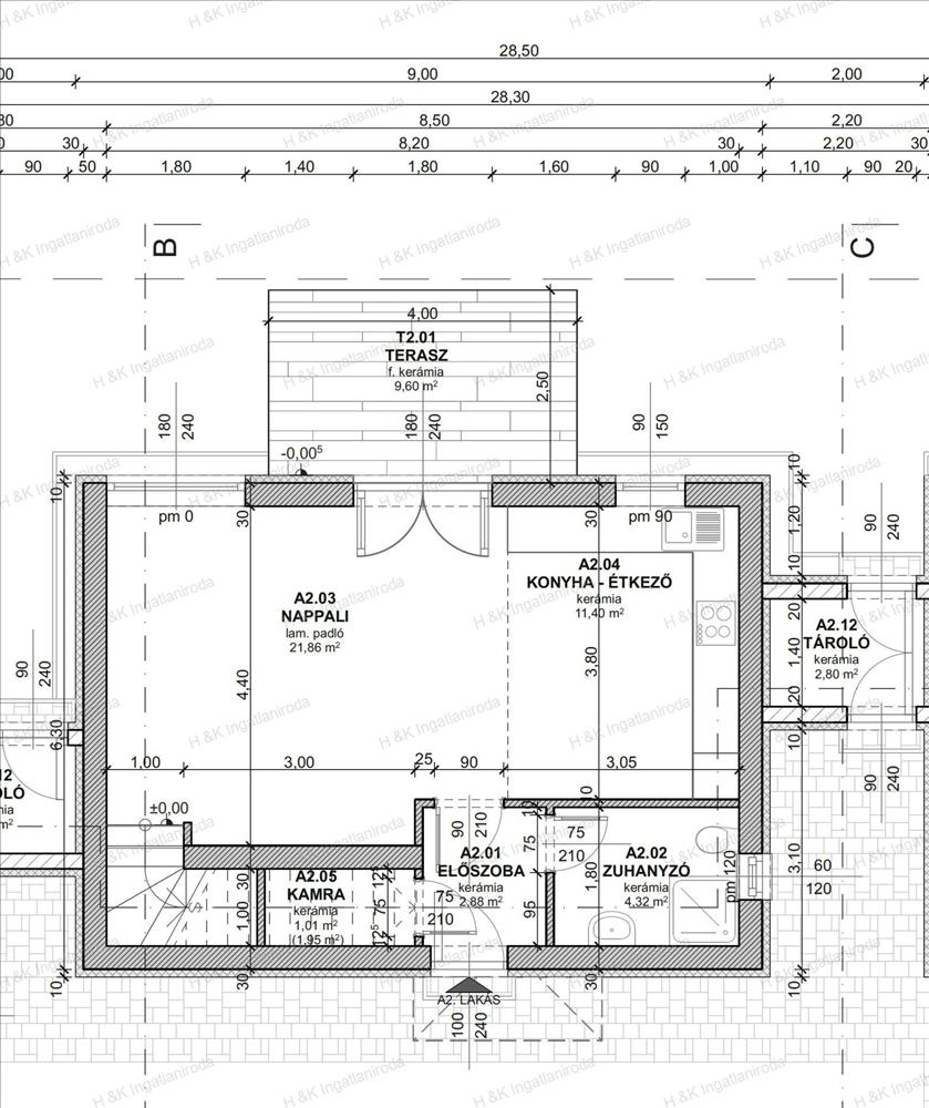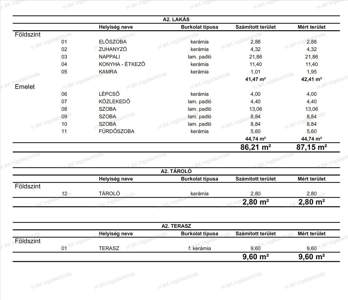 A lakások bruttó területe 92 nm , nettó lakóterület 87, 15 nm + terasz + a 2-es lakásnál 2, 8 nm külső tároló, belső kétszintes, nappali + három hálószobás, dupla-komfortos elrendezéssel.