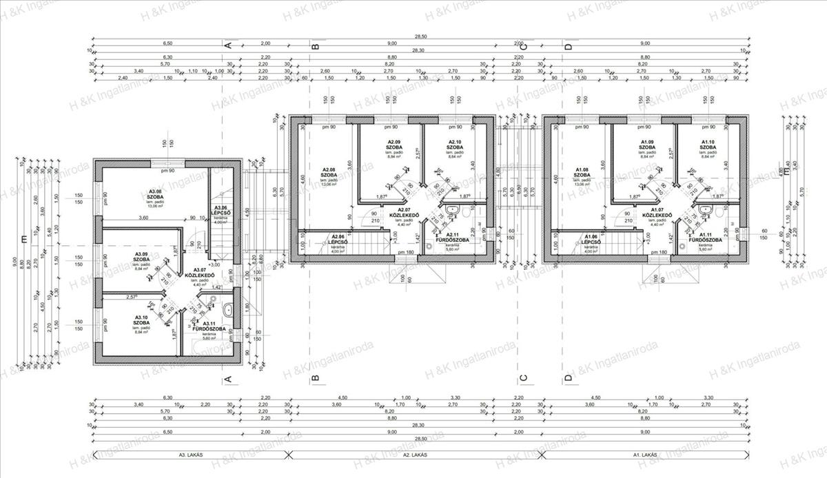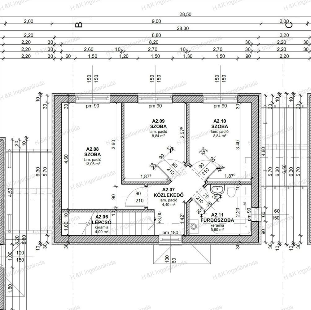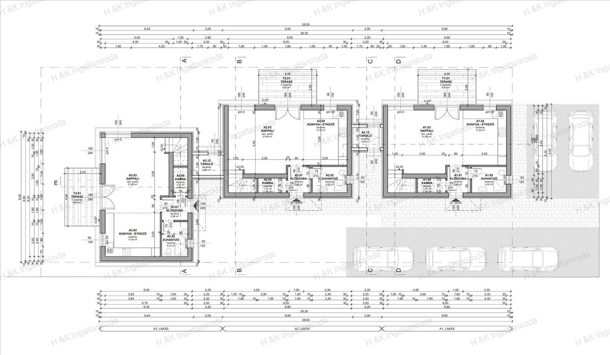 A földszinten (42, 41 nm ) tágas, amerikai konyhás nappali 33, 26 nm , előtér 2, 88 nm , zuhanyzós fürdőszoba 4, 32 nm , lépcső alatti tároló/kamra 1, 95 nm , valamint 9, 6 nm -es terasz kerül kialakításra.                                                                                                                                                                                                                                 Az emeleti szinten (44, 74 nm ) három külön nyíló hálószoba kap helyet (kettő 8, 84 nm -es, egy 13, 06 nm -es), továbbá 5, 6 nm -es fürdőszoba és 4, 4 nm -es közlekedő egészíti ki a lakóteret.