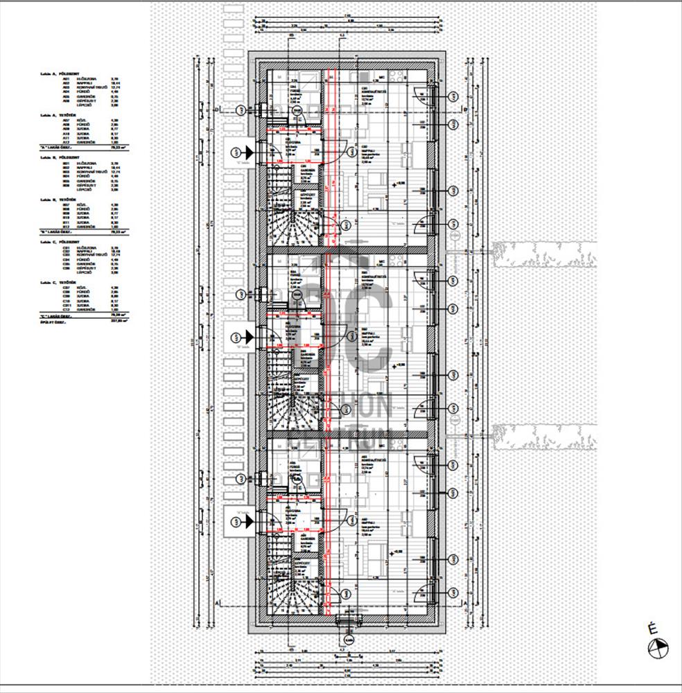 A 600-800 nm-es telken 3 db lakás található eltérő méretű saját használatú kerttel és kocsibeállóval.