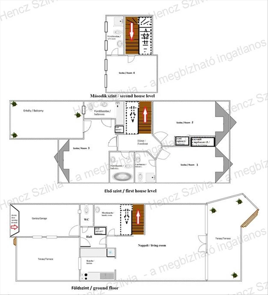 - Földszint: Amerikai konyhás nappali, tároló, mosókonyha, vendég-WC, első és hátsó terasz.