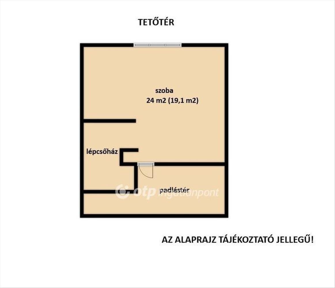 A tetőtérben egy tekintélyes méretű, 19 m2-es szoba található, valamint egy különálló padlástér.