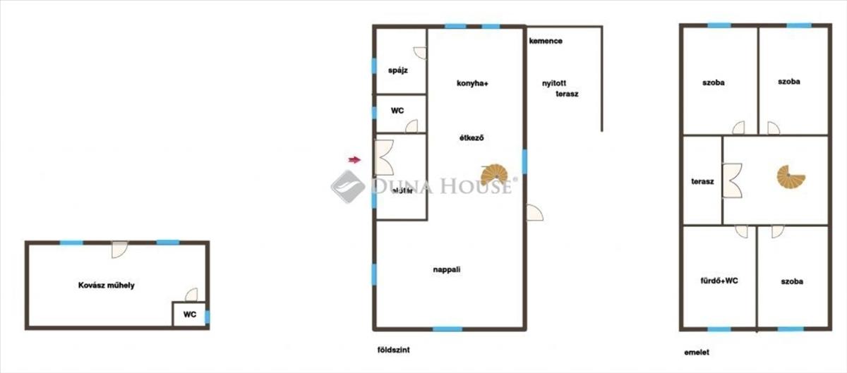 - földszinten: amerikai konyhás nappali, kamra, előtér, wc, nyitott teraszon: búbos